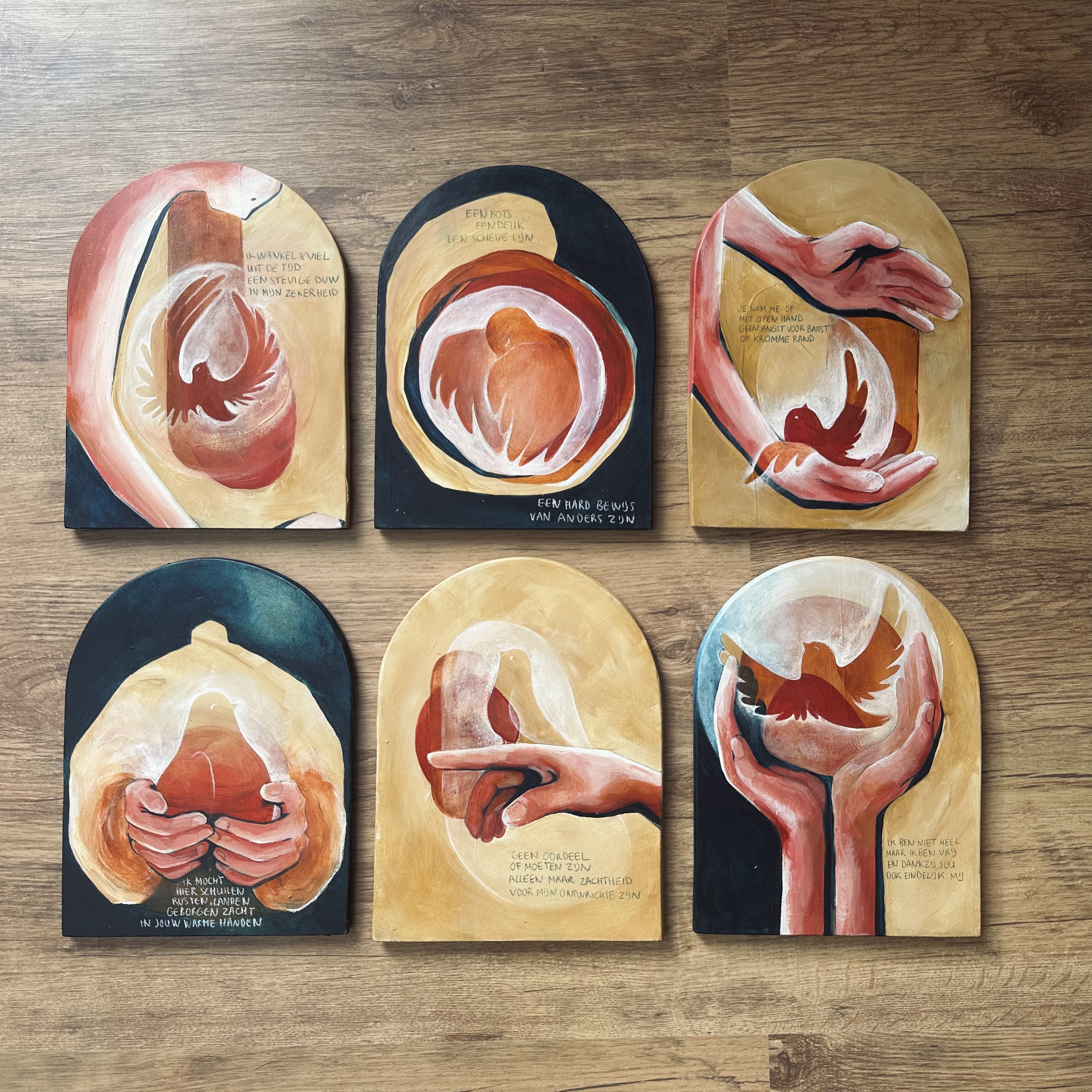 In mijn atelier vind je me vaak terug met een berg materiaal, een hoop tassen koffie en een hoofd vol ideeën. Ik teken, schilder en creëer beelden die kunnen raken – soms ontroerend, soms speels, en altijd vanuit het hart. Emoties, ervaringen en verhalen zijn mijn grootste bron van inspiratie. Ik laat me niet graag vastpinnen op één stijl of materiaalkeuze. Potlood, verf, digitaal, papier, hout, of iets daartussenin? Alles kan, zolang het juist voelt.